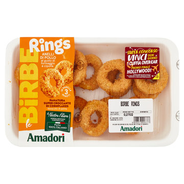 Carne di pollo 50 % Pangrattato (farina di frumento, sale, lievito di birra, estratto di spezie: paprica) Acqua Olio di girasole Fiocchi di mais 5,5 % Farina di frumento Formaggio 3 % (latte, sale, fermenti lattici, caglio microbico) Amido di frumento Farina di mais Amido di patata Glutine di frumento Aromi (con latte, lattosio) Sale iodato (sale, iodato di potassio 0,007 %) Fibra di pisello Amido di pisello Cipolla disidratata 0,4 % Sale Albume d'uovo in polvere Antiossidanti: ascorbato di sodio, estratti di rosmarino Aromi naturali Agenti lievitanti: difosfato disodico, carbonato acido di sodio Può contenere soia, sedano, senape